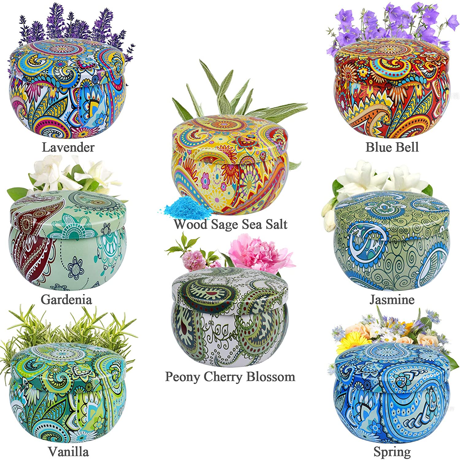 - 8 WONDERFUL FRAGANCES Scented with 8 pleasant scents: gardenia, lavender, jasmine, vanilla, spring, blue campanula, sage & sea, peony & cherry. Relax yourself in a scented atmosphere, that is the charm of scented candles.